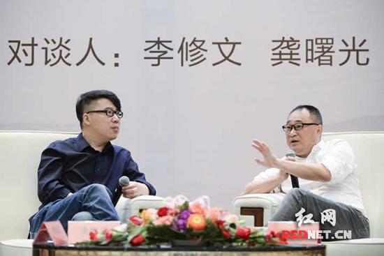 5月31日,河北廊坊,作家、影視劇編劇、監制李修文(左)和湖南出版投資控股集團黨委書記、董事長,中南傳媒董事長龔曙光(右)進行題為“人民山河文辭袈裟”的文學對談。攝影/辜鵬博
